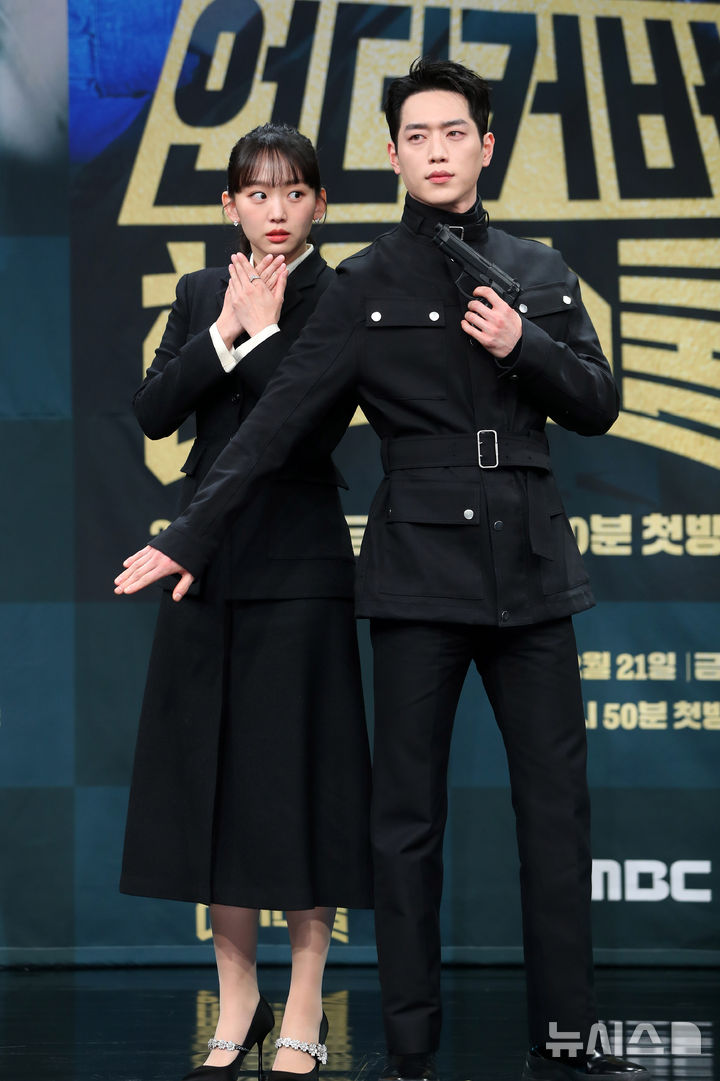 [서울=뉴시스] 김혜진 기자 = 배우 진기주(왼쪽), 서강준이 20일 오후 서울 마포구 MBC사옥에서 열린 MBC 금토드라마 '언더커버 하이스쿨' 제작발표회에서 포즈를 취하고 있다.