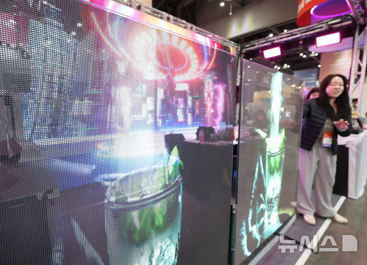 [고양=뉴시스] 전진환 기자 = 20일 오후 경기도 고양시 킨텍스에서 열린 2025 코리아빌드위크 한 업체 관계자가 투명 디스플레이를 설명하고 있다 2025.02.20. [email protected]