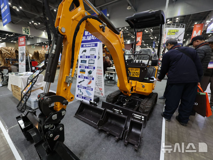 [고양=뉴시스] 전진환 기자 = 20일 오후 경기도 고양시 킨텍스에서 열린 2025 코리아빌드위크를 찾은 관람객들이 미니 굴착기를 살펴보고 있다 2025.02.20. [email protected]