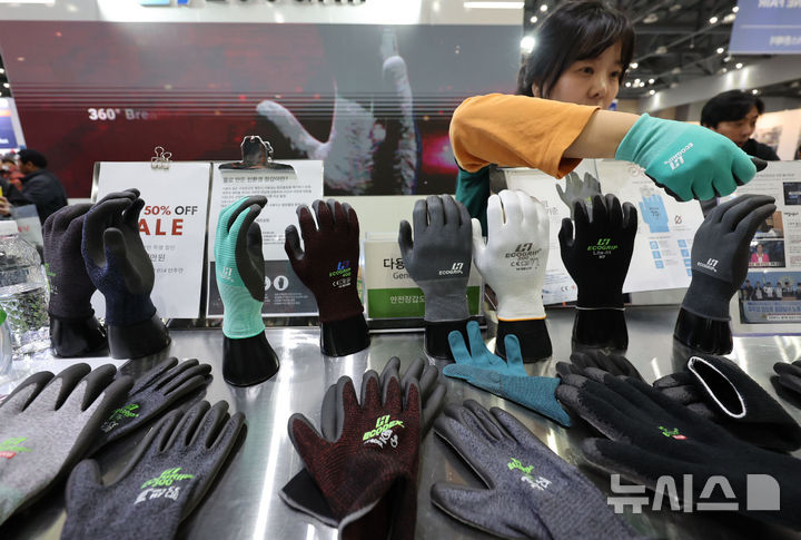 [고양=뉴시스] 전진환 기자 = 20일 오후 경기도 고양시 킨텍스에서 열린 2025 코리아빌드위크에서 한 업체 관계자가 친환경 코팅장갑을 설명하고 있다 2025.02.20. [email protected]