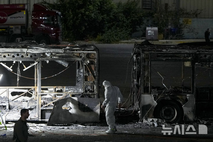 [바트얌=AP/뉴시스] 20일(현지 시간) 이스라엘 중부 바트얌에서 경찰이 일련의 버스 폭발 현장 중 한 곳을 살피고 있다. 이날 텔아비브 인근에서 버스 3대가 연쇄 폭발해 당국은 테러를 의심하고 있다. 2025.02.21.