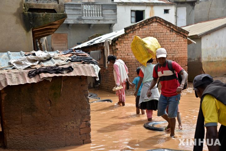 [안타나나리보=신화/뉴시스] 20일(현지 시간) 마다가스카르 수도 안타나나리보에서 주민들이 침수된 도로를 건너고 있다. 마다가스카르에 지난 14일부터 내린 폭우로 지금까지 사망자 숫자가 11명으로 늘어났다고 국가위기재난관리국(BNGRC)이 이날 밝혔다. 2025.02.21.