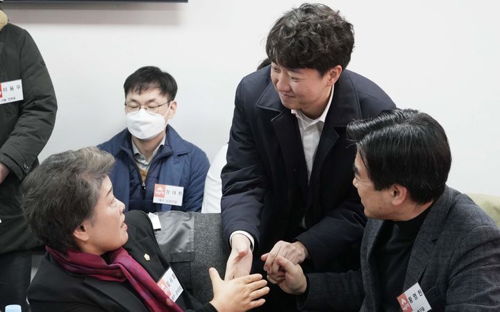 [서울=뉴시스] 조성봉 기자 = 이준석 개혁신당 의원이 21일 오전 서울 여의도 국회 의원회관 간담회의실에서 열린 2025년 1차 전국 당협위원장 간담회에서 참석자들과 인사를 하고 있다. (사진=개혁신당 제공) 2025.02.21. [email protected]