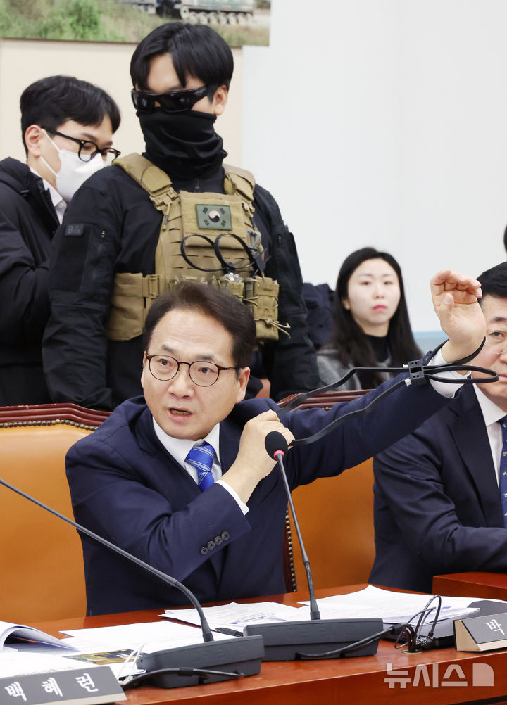 [서울=뉴시스] 조성우 기자 = 박선원 더불어민주당 의원이 21일 오전 서울 여의도 국회에서 열린 윤석열 정부의 비상계엄 선포를 통한 내란 혐의 진상규명 국정조사 특별위원회 4차 청문회에서 케이블타이 시연을 하고 있다. 2025.02.21. [email protected]