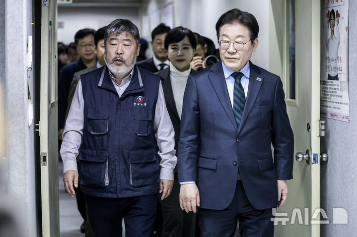 [서울=뉴시스] 정병혁 기자 = 김동명 한국노총 위원장과 이재명 더불어민주당 대표가 21일 서울 영등포구 한국노총에서 열린 한국노총-더불어민주당 대표 간담회에 참석하고 있다. 2025.02.21. [email protected]