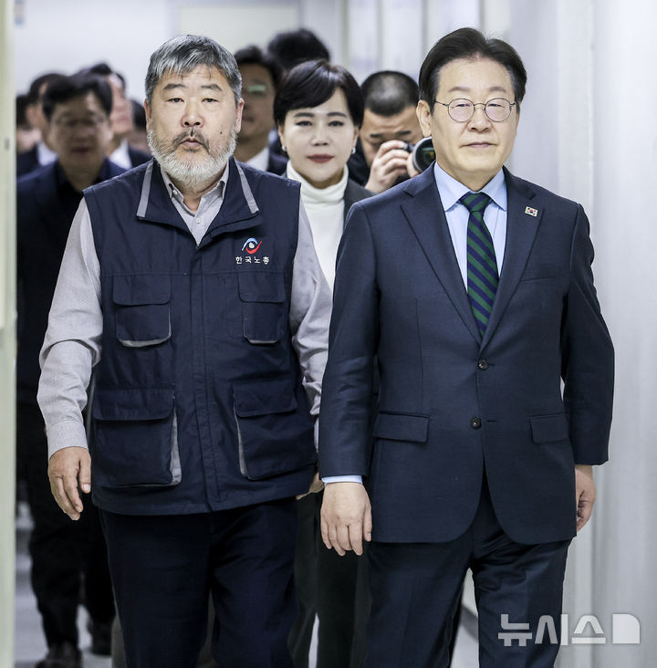 [서울=뉴시스] 정병혁 기자 = 김동명 한국노총 위원장과 이재명 더불어민주당 대표가 21일 서울 영등포구 한국노총에서 열린 한국노총-더불어민주당 대표 간담회에 참석하고 있다. 2025.02.21. [email protected]