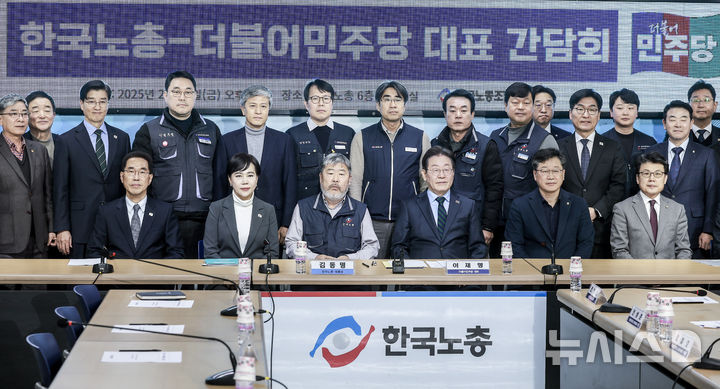 [서울=뉴시스] 정병혁 기자 = 이재명 더불어민주당 대표가 21일 서울 영등포구 한국노총에서 열린 한국노총-더불어민주당 대표 간담회에 앞서 김동명 한국노총 위원장을 비롯한 참석자들과 기념촬영을 하고 있다. 2025.02.21. [email protected]