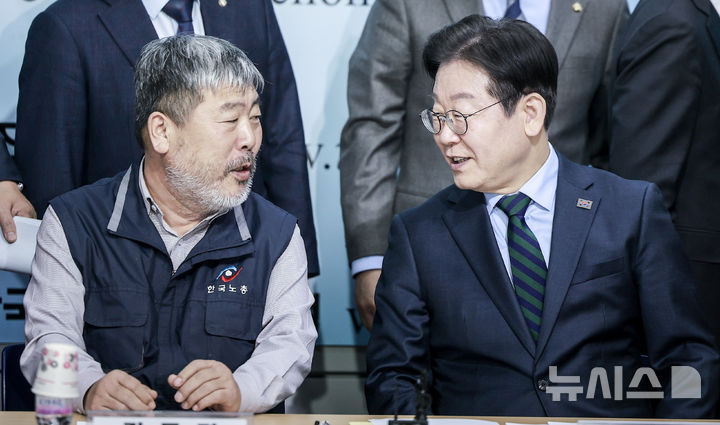 [서울=뉴시스] 정병혁 기자 = 이재명 더불어민주당 대표가 21일 서울 영등포구 한국노총에서 열린 한국노총-더불어민주당 대표 간담회에 앞서 김동명 한국노총 위원장과 대화를 나누고 있다. 2025.02.21. [email protected]