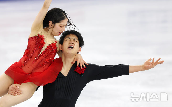 [서울=뉴시스] 김명년 기자 = 일본 미우라 리쿠와 키하라 류이치가 21일 서울 목동아이스링크에서 열린 2025 ISU(국제빙상경기연맹) 사대륙 피겨스케이팅 선수권 대회 페어 프리스케이팅에서 연기를 펼치고 있다. 2025.02.21. [email protected]