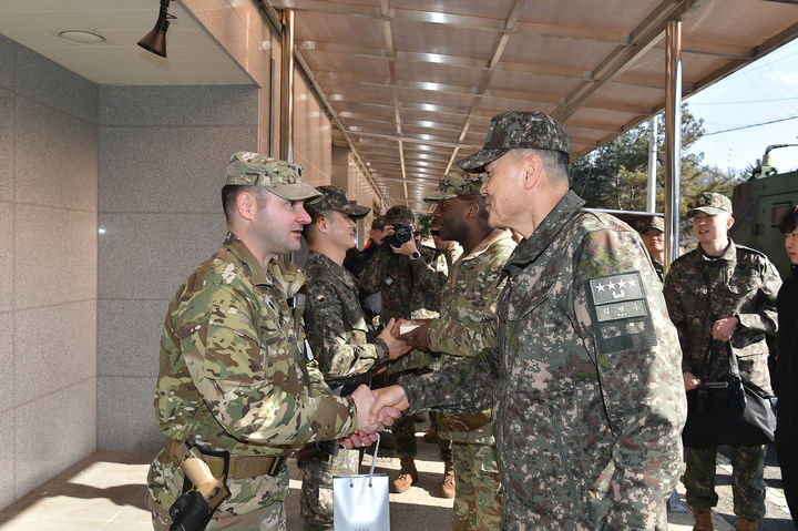 [서울=뉴시스] 황준선 기자 = 김명수 합참의장과 브런슨 연합사령관이 판문점 공동경비구역(JSA)을 방문해 한미 장병을 격려하고 있다. (사진=합동참모본부 제공) 2025.02.21. [email protected] *재판매 및 DB 금지
