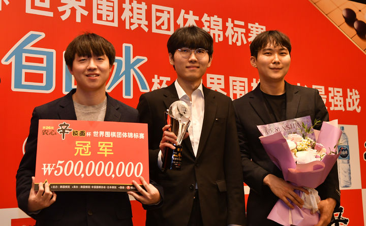 [서울=뉴시스] 황준선 기자 = 신진서(가운데) 9단이 21일(현지시간) 중국 상하이 그랜드 센트럴 호텔에서 열린 제26회 농심신라면배 세계바둑최강전 최종국에서 중국 딩하오 9단을 꺾으며 우승을 차지한 뒤 기념촬영하고 있다. (사진=한국기원 제공) 2025.02.21. [email protected] *재판매 및 DB 금지