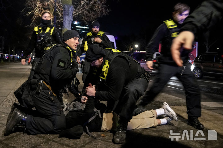 [베를린=AP/뉴시스] 21일(현지 시간) 독일 베를린의 홀로코스트 기념관 인근에서 흉기난동이 발생해 경찰이 용의자로 보이는 한 남성을 체포하고 있다. 현지 경찰은 스페인 관광객 1명이 흉기 공격을 받아 부상했으며 용의자를 붙잡아 범행 동기와 사용 흉기 등을 조사하고 있다고 밝혔다. 2025.02.22.