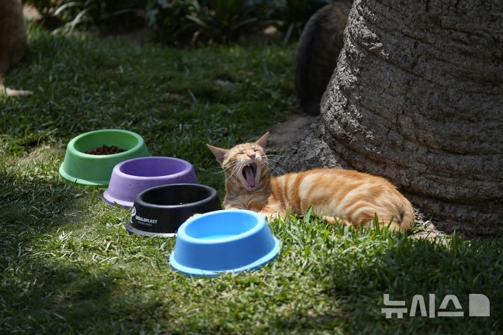 [리마=AP/뉴시스] 21일(현지 시간) 페루 리마의 미라플로레스 해안 지구에 있는 케네디 공원에서 길고양이 한 마리가 사료통 주변에 누워 늘어지게 하품하고 있다. 2025.02.22.