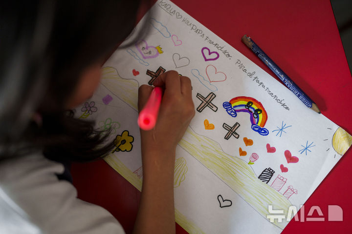 [마드리드=AP/뉴시스] 21일(현지 시간) 스페인 마드리드의 한 학교에서 카를라(7)가 프란치스코 교황의 건강을 기원하는 그림을 그리고 있다. 이 그림은 폐렴 치료 중인 교황에게 전달될 예정이다. 2025.02.22.