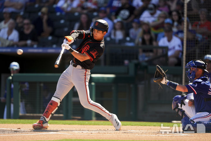 [서프라이즈=AP/뉴시스] 샌프란시스코 자이언츠의 이정후가 22일(현지 시간) 미 애리조나주 서프라이즈 스타디움에서 열린 텍사스 레인저스와 시범 경기 1회 초 안타를 치고 있다. 이정후는 3번 중견수로 선발 출장해 3타수 1안타 1삼진을 기록했고 샌프란시스코는 6-1로 승리했다. 2025.02.23.