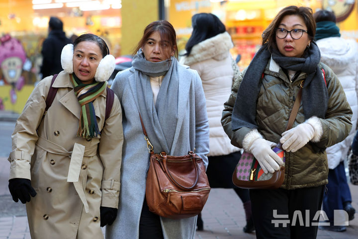 [서울=뉴시스] 홍효식 기자 = 서울 아침 최저기온이 영하 6도 등 추위가 이어지는 23일 오전 서울 중구 명동을 찾은 관광객들이 목도리를 두른 채 이동하고 있다. 2025.02.23. [email protected]