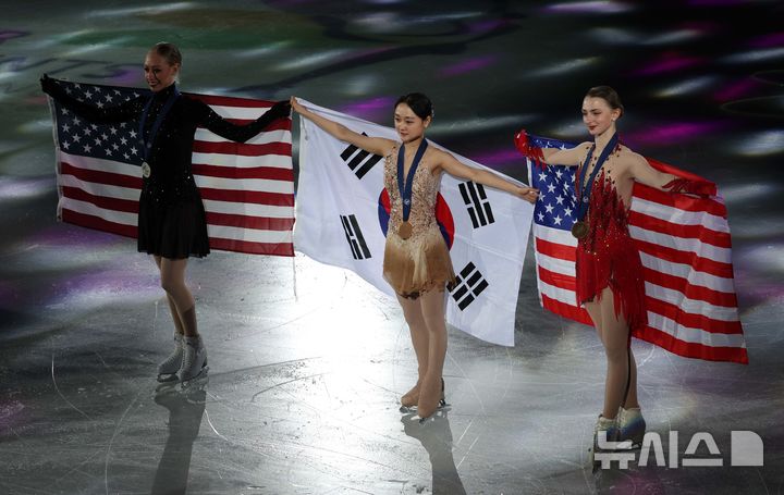 [서울=뉴시스] 고범준 기자 = 23일 오후 서울 양천구 목동 아이스링크에서 열린 2025 ISU 4대륙 피겨 선수권대회 여자 싱글 프리스케이팅에서 금메달을 획득한 김채연이 세리머니를 하고 있다. 왼쪽부터 브레이디 테넬(미국, 은메달), 김채연, 사라 에버하르트(미국, 동메달). 2025.02.23. [email protected]