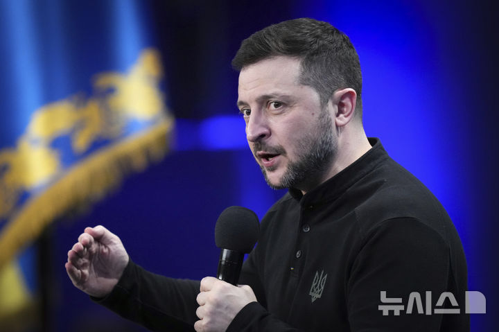 [키이우=AP/뉴시스] 볼로디미르 젤렌스키 우크라이나 대통령이 23일(현지 시간) 키이우에서 열린 기자회견 중 취재진 질문에 답하고 있다. 젤렌스키 대통령은 러시아의 우크라이나 침공 3주년을 하루 앞두고 열린 기자회견에서 우크라이나가 북대서양조약기구(NATO)에 가입할 수 있다면 대통령 자리에서 물러날 수 있다고 말했다. 2025.02.24.