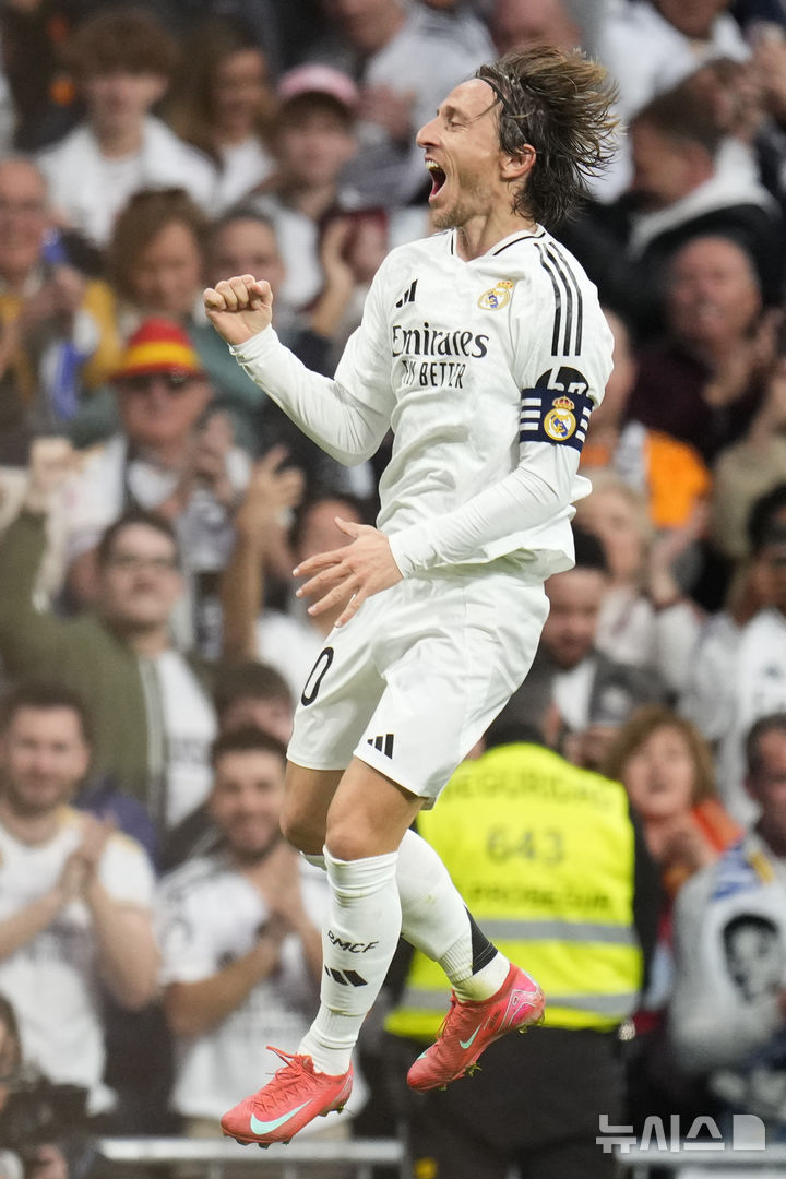 [마드리드=AP/뉴시스] 레알 마드리드의 루카 모드리치가 23일(현지 시간) 스페인 마드리드의 산티아고 베르나베우 스타디움에서 열린 2024-25 라리가 25라운드 지로나와 경기 전반 41분 선제골을 넣고 세리머니하고 있다. 올해 40세인 모드리치는 이날 선발로 나서 원더골을 넣어 노익장을 과시하며 팀의 2-0 승리를 이끌었다. 2025.02.24.