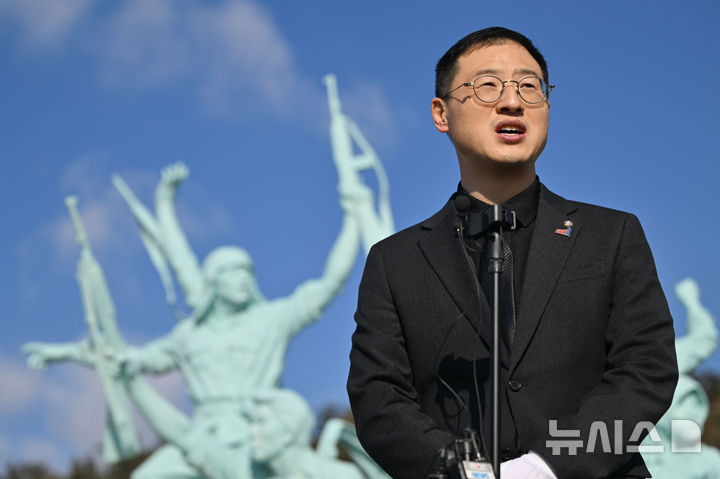 [광주=뉴시스] 이영주 기자 = 국민의힘 김상욱 의원이 24일 오전 광주 북구 운정동 국립5·18민주묘지를 찾아 5·18 당시 폭력 계엄군에 맞섰던 시민군을 상징하는 무장항쟁군상 앞에서 취재진 인터뷰를 하고 있다. 2025.02.24. [email protected]