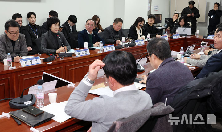 [서울=뉴시스] 조성우 기자 = 오세희(왼쪽 두 번째) 더불어민주당 전국소상공인위원회 위원장이 24일 오후 서울 여의도 국회 의원회관에서 열린 전국상인연합회, 허종식 더불어민주당 의원 주최로 온누리상품권 부정 유통 실태와 전통시장 지원 과제 간담회에서 발언하고 있다. 2025.02.24. [email protected]