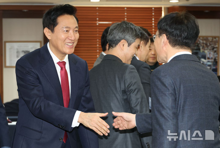 [서울=뉴시스] 김명원 기자 = 오세훈 서울시장이 24일 서울 종로구 정부서울청사에서 열린 제1차 서울혁신대학지원위원회 회의에 참석며 위원들과 인사하고 있다. 2025.02.24. [email protected]