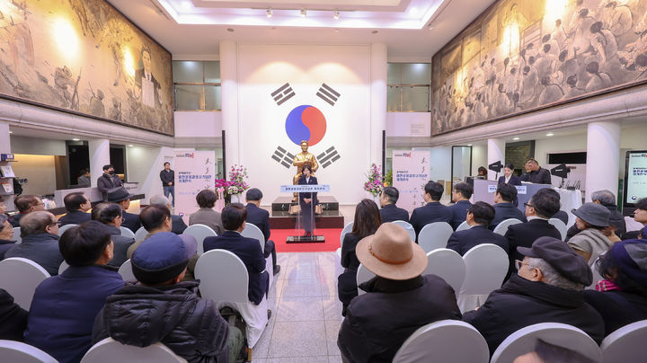 [서울=뉴시스] 고범준 기자 = 강정애 국가보훈부 장관이 24일 오후 서울시 서초구 매헌윤봉길의사기념관에서 열린 매헌윤봉길의사기념관 재개관식에 참석해 기념사를 하고 있다. (사진=국가보훈부 제공) 2025.02.24. [email protected] *재판매 및 DB 금지