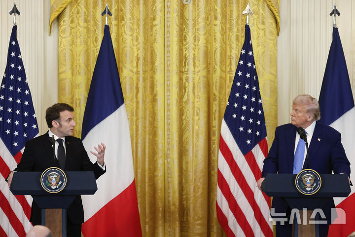 [워싱턴=AP/뉴시스] 도널드 트럼프(오른쪽) 미국 대통령과 에마뉘엘 마크롱 프랑스 대통령이 24일(현지 시간) 미국 백악관 이스트룸에서 공동 기자회견하고 있다. 트럼프 대통령은 마크롱 대통령과 회담에서 러-우크라이나 전쟁을 수주일 안에 종식할 수 있다고 밝혔다. 2025.02.25.