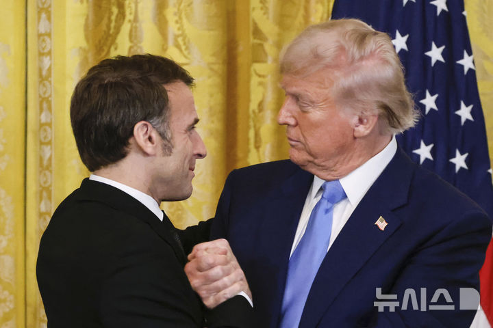 [워싱턴=AP/뉴시스] 도널드 트럼프(오른쪽) 미국 대통령과 에마뉘엘 마크롱 프랑스 대통령이 24일(현지 시간) 미국 백악관 이스트룸에서 공동 기자회견하면서 악수하고 있다. 트럼프 대통령은 마크롱 대통령과 회담에서 러-우크라이나 전쟁을 수주일 안에 종식할 수 있다고 밝혔다. 2025.02.25.