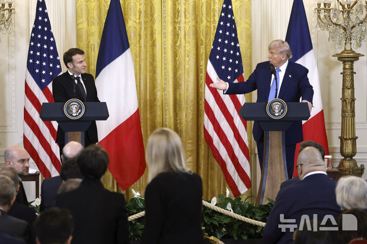 [워싱턴=AP/뉴시스] 도널드 트럼프(오른쪽) 미국 대통령과 에마뉘엘 마크롱 프랑스 대통령이 24일(현지 시간) 미국 백악관 이스트룸에서 공동 기자회견하고 있다. 트럼프 대통령은 마크롱 대통령과 회담에서 러-우크라이나 전쟁을 수주일 안에 종식할 수 있다고 밝혔다. 2025.02.25.