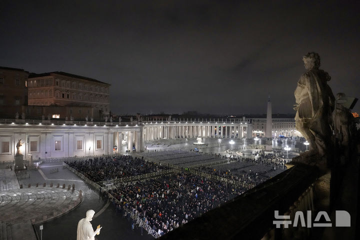 [바티칸시국=AP/뉴시스] 24일(현지 시간) 바티칸시국 성 베드로광장에서 가톨릭 신자들이 프란치스코 교황의 건강 회복을 위한 묵주 기도를 드리고 있다. 호흡기 질환으로 11일째 입원 중인 프란치스코 교황이 중증 폐렴과 신부전으로 위중한 상황인 것으로 알려졌다. 2025.02.25.