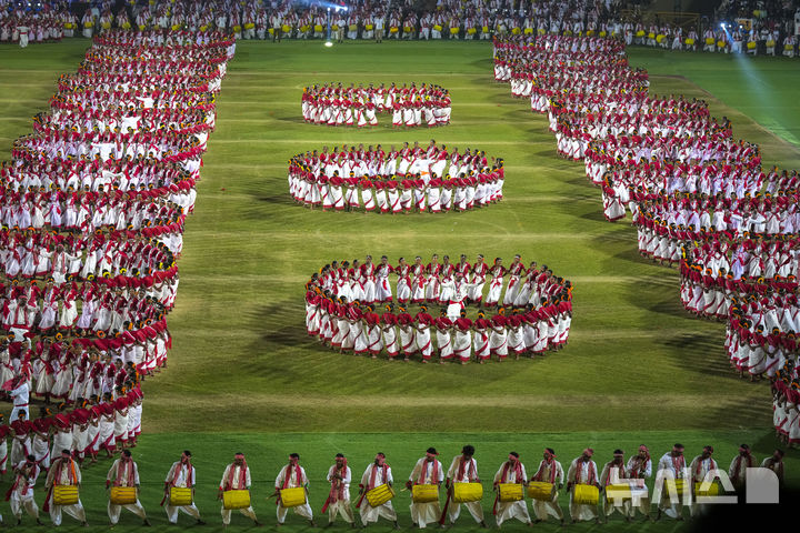 [구와하티=AP/뉴시스] 24일(현지 시간) 인도 아삼주 구와하티 사루사제 경기장에서 세계 기록 도전에 나선 '차 부족'(Tea-Tribe) 청년들이 주무르(jhumur) 춤을 추고 있다. 이날 아삼차 산업 200주년을 기념하는 행사에 나렌드라 모디 총리도 참석한 가운데 8600명이 주무르 춤에 참여한 것으로 알려졌다. '차 부족'이라는 용어는 차밭에서 일하는 노동자와 그 후손들로 이루어진 다문화, 다민족 공동체를 넓게 일컫는 말이다. 2025.02.24.