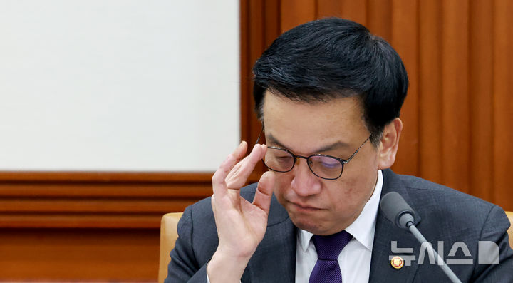 [서울=뉴시스] 최진석 기자 = 최상목 대통령 권한대행 부총리 겸 기획재정부 장관이 25일 정부서울청사에서 열린 '국정현안관계장관회의 겸 경제관계장관회의'에서 안경을 고쳐쓰고 있다. (대통령실통신사진기자단) 2025.02.25. [email protected]