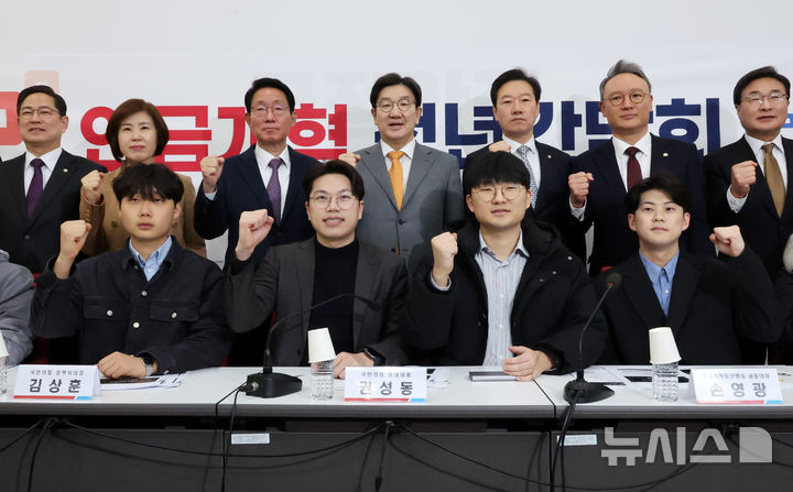 [서울=뉴시스] 조성우 기자 = 권성동(뒷줄 왼쪽 네 번째) 국민의힘 원내대표가 25일 오전 서울 여의도 국회에서 열린 연금개혁 청년 간담회에서 손영광(앞줄 왼쪽 두 번째부터), 김상종 연금개혁청년행동 공동대표 등 참석자들과 기념촬영하고 있다. 2025.02.25. [email protected]