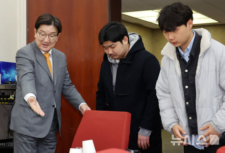 [서울=뉴시스] 조성우 기자 = 권성동(왼쪽) 국민의힘 원내대표가 25일 오전 서울 여의도 국회에서 열린 연금개혁 청년 간담회에서 청년 참석자들을 자리로 안내하고 있다. 2025.02.25. [email protected]