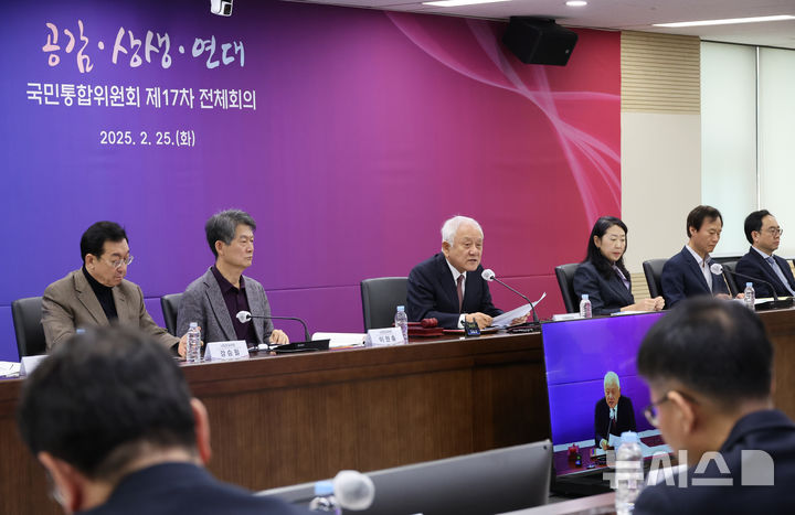 [서울=뉴시스] 김명원 기자 = 김한길 국민통합위원장이 25일 오전 서울 종로구 정부서울청사에서 열린 국민통합위원회 제17차 전체회의에 참석해 발언하고 있다. 2025.02.25. [email protected]