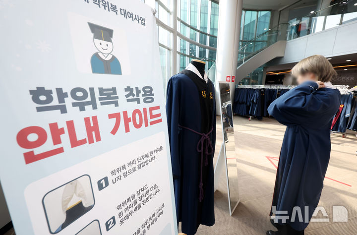 [서울=뉴시스] 홍효식 기자 = 성균관대학교 2025년 겨울 학위수여식 열린 25일 서울 종로구 성균관대에서 졸업생들이 학위복을 대여해 착용하고 있다. 2025.02.25. [email protected]