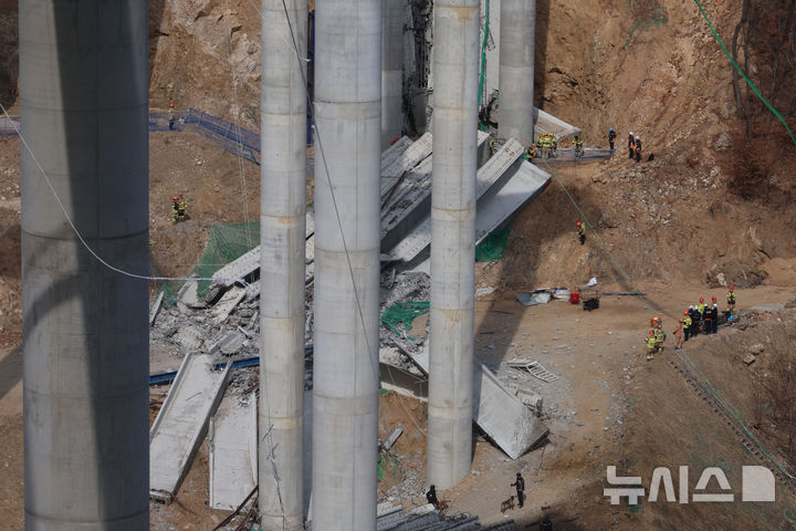 [안성=뉴시스] 김금보 기자 = 25일 경기도 안성시 서운면 산평리 서울세종고속도로 천안~안성 구간 연결공사 교량 작업 중 교량을 떠받치던 50m 철구조물이 무너져 내려 작업 중이던 인부들이 숨지거나 다쳤다. 사고현장에서 구조대원들이 수색 구조 활동을 하고 있다. 2025.02.25. [email protected]