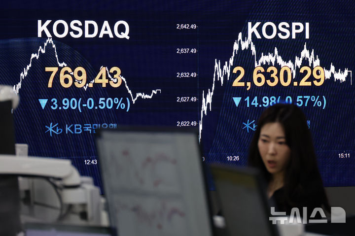 코스피가 전 거래일보다 14.98포인트(0.57%) 내린 2630.29에 마감했다. 코스닥 지수는 전 거래일보다 3.9포인트(0.5%) 하락한 769.43, 원·달러 환율은 전 거래일보다 3.0원 오른 1430.4원에 마감했다. 2025.02.25. [email protected]