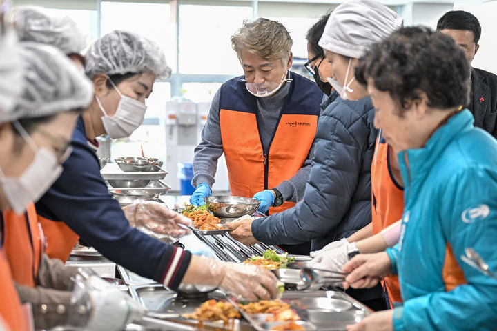 [광주=뉴시스] 이영주 기자 = 김이강 광주 서구청장이 25일 광주 서구 서빛마루시니어센터 경로식당에서 센터 이용 어르신들에게 배식봉사를 하고 있다. (사진 = 광주 서구 제공) 2025.02.25. [email protected]
