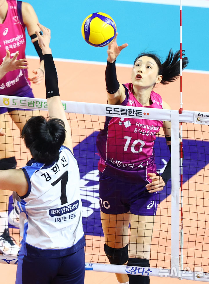 [인천=뉴시스] 황준선 기자 = 25일 인천 부평구 인천삼산월드체육관에서 열린 프로배구 2024-2025 V리그 여자부 흥국생명 핑크스파이더스와 IBK기업은행 알토스의 경기, 흥국생명 김연경이 공격을 시도하고 있다. 2025.02.25. [email protected]