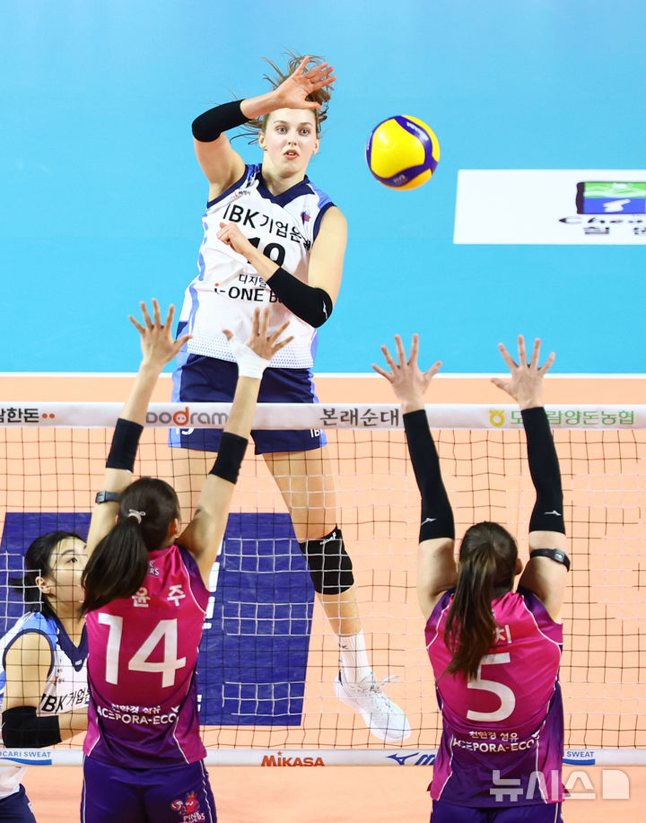 [인천=뉴시스] 황준선 기자 = 25일 인천 부평구 인천삼산월드체육관에서 열린 프로배구 2024-2025 V리그 여자부 흥국생명 핑크스파이더스와 IBK기업은행 알토스의 경기, 기업은행 빅토리아가 공격을 시도하고 있다. 2025.02.25. [email protected]