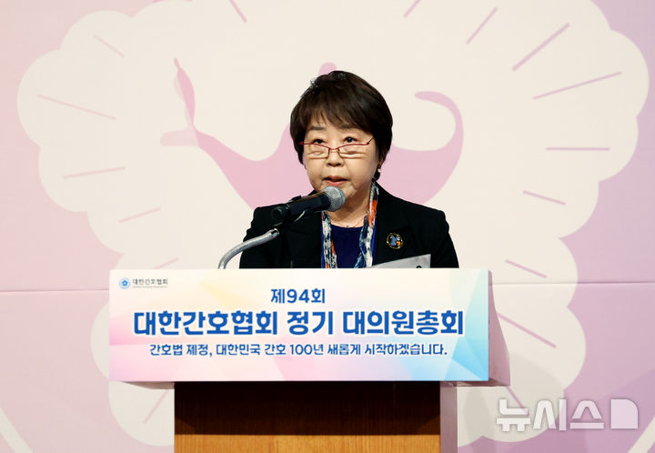 [서울=뉴시스] 김진아 기자 = 탁영란 대한간호협회 회장이 26일 서울 중구 롯데호텔에서 열린 대한간호협회 제94회 정기 대의원총회에서 개회사를 하고 있다. 2025.02.26. [email protected]