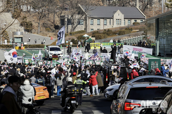 [서울=뉴시스] 최동준 기자 = 이화여대 긴급행동, 탄핵을 반대하는 이화인 등이 26일 서울 서대문구 이화여자대학교 정문 앞에서 각각 윤석열 대통령 탄핵 찬성, 반대를 촉구하고 있다. 2025.02.26. [email protected]