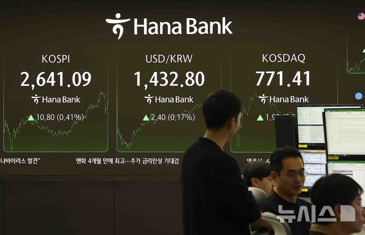 [서울=뉴시스] 김근수 기자 = 코스피가 전 거래일(2630.29)보다 10.80포인트(0.41%) 오른 2641.09에 장을 마친 26일 서울 중구 하나은행 딜링룸에서 딜러들이 업무를 보고 있다.