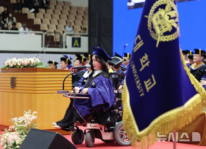 [서울=뉴시스] 김진아 기자 = 재학 기간 동안 공헌활동을 지속해온 사범대학 영어교육과 장세원 씨가 26일 서울 관악구 서울대학교 에서 열린 제79회 전기 학위수여식에서 졸업생 대표인사를 하고 있다.