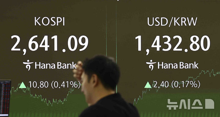 [서울=뉴시스] 김근수 기자 = 코스피가 전 거래일(2630.29)보다 10.80포인트(0.41%) 오른 2641.09에 장을 마친 26일 서울 중구 하나은행 딜링룸에서 딜러가 업무를 보고 있다.