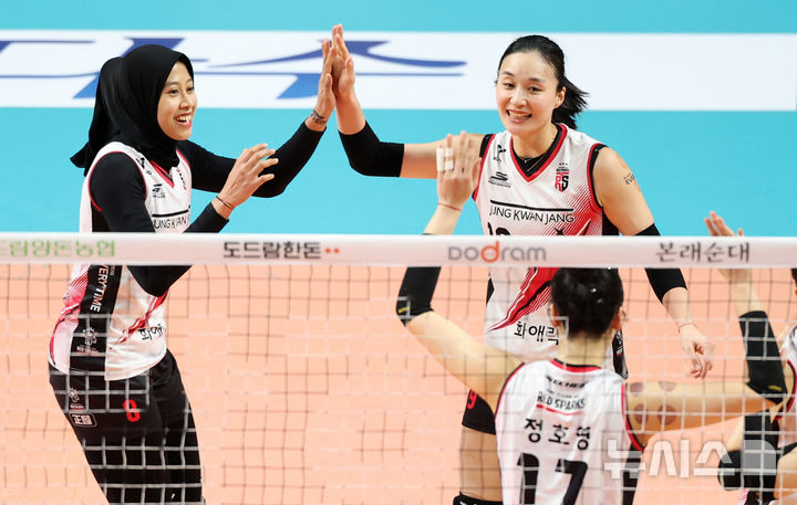 [서울=뉴시스] 김선웅 기자 = 26일 서울 중구 장충체육관에서 열린 2024-2025 V-리그 정관장과 GS칼텍스의 경기, 정관장 메가, 표승주가 팀 득점에 하이파이브를 하고 있다. 2025.02.26. [email protected]