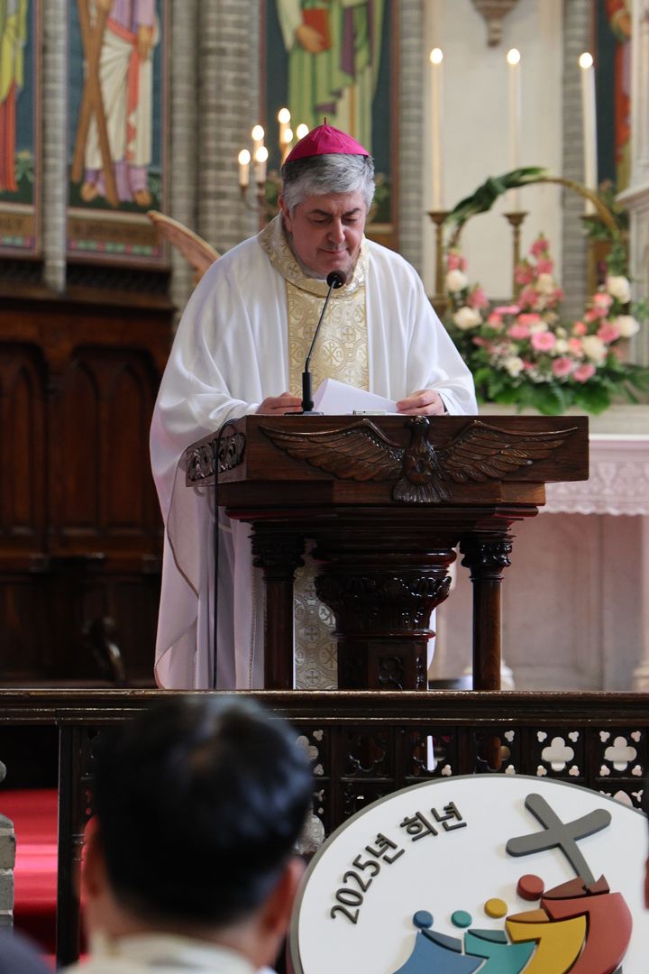 [서울=뉴시스] 황준선 기자 = 주한 교황대사 조반니 가스파리 대주교가 26일 서울 중구 명동대성당에서 열린 한국외방선교회 설립 50주년 기념 미사에서 프란치스코 교황의 축하 메시지를 대독하고 있다. (사진=천주교 서울대교구 제공) 2025.02.26. [email protected]