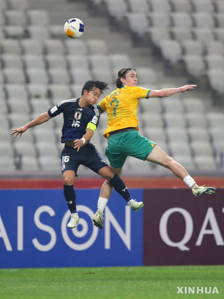 [선전=신화/뉴시스] 호주의 대니얼 베니(오른쪽)가 26일(현지 시간) 중국 광둥성 선전의 바오안 스타디움에서 열린 2025 아시아축구연맹(AFC) 20세 이하(U-20) 아시안컵 준결승전 일본과 경기 중 공을 다투고 있다. 호주가 일본을 2-0으로 꺾고 결승에 올라 사우디아라비아와 우승을 다툰다. 2025.02.27.